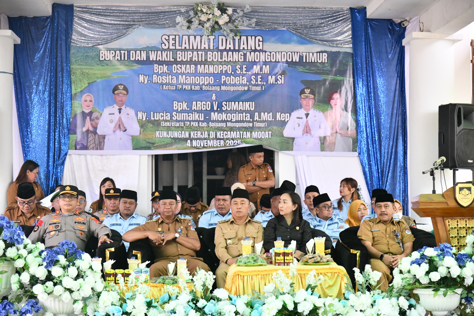 Bupati meyakini bahwa kerja keras yang didukung oleh semangat kebersamaan dan niat tulus akan menjadikan Kecamatan Mooat sebagai kawasan unggulan di Kabupaten Bolaang Mongondow Timur, khususnya di sektor pertanian, pariwisata, dan ekonomi kreatif. Sebagai bentuk nyata perhatian pemerintah terhadap kebutuhan masyarakat, Bupati bersama Wakil Bupati menyerahkan sejumlah bantuan sosial kepada warga setempat. Kegiatan ini turut dihadiri berbagai pihak seperti Unsur Forkopimda, Sekretaris Daerah, para asisten dan tenaga ahli pemerintah kabupaten, serta anggota DPRD Kabupaten Bolaang Mongondow Timur. (DRM)