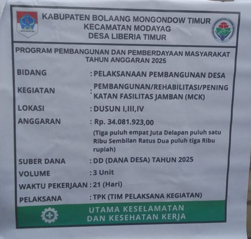 Sekretaris Desa, Rivo Ramadagandi, menyampaikan bahwa anggaran untuk pembangunan ketiga fasilitas MCK tersebut mencapai Rp 34.081.923,00. Dana tersebut bersumber dari Dana Desa (DD) melalui APBDes Liberia Timur tahun 2025.