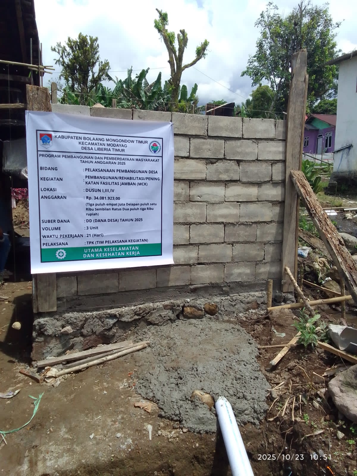 Faktabmr.co. Liberia Timur Boltim – Pemerintah Desa Liberia Timur, Kecamatan Modayag, Kabupaten Bolaang Mongondow Timur, telah memulai pembangunan tiga unit fasilitas MCK (mandi, cuci, kakus) bagi warganya sejak 10 Oktober 2025.